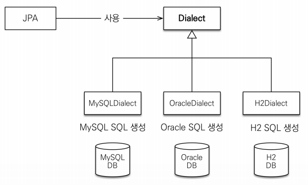 이러한 차이를 방언(Dialect)라고 하며, JPA에서는 추상화된 방언 클래스를 제공한다. JPA를 사용하지 않으면 애플리케이션의 DBMS가 변경될 경우 혹은 같은 애플리케이션을 다른 DBMS에서 동작시켜야하는 경우 기존에 작성된 SQL을 모두 수정해야하지만, JPA를 사용하면 이 Dialect 덕분에 그러한 시간과 비용을 아낄 수 있다.