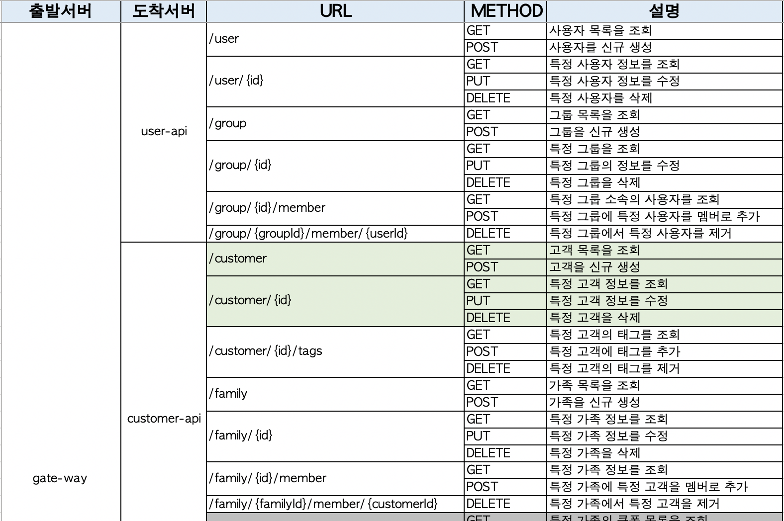 그래서 각 어플리케이션별 구현한 API를 취합해 엑셀로 정리를 해봤다.