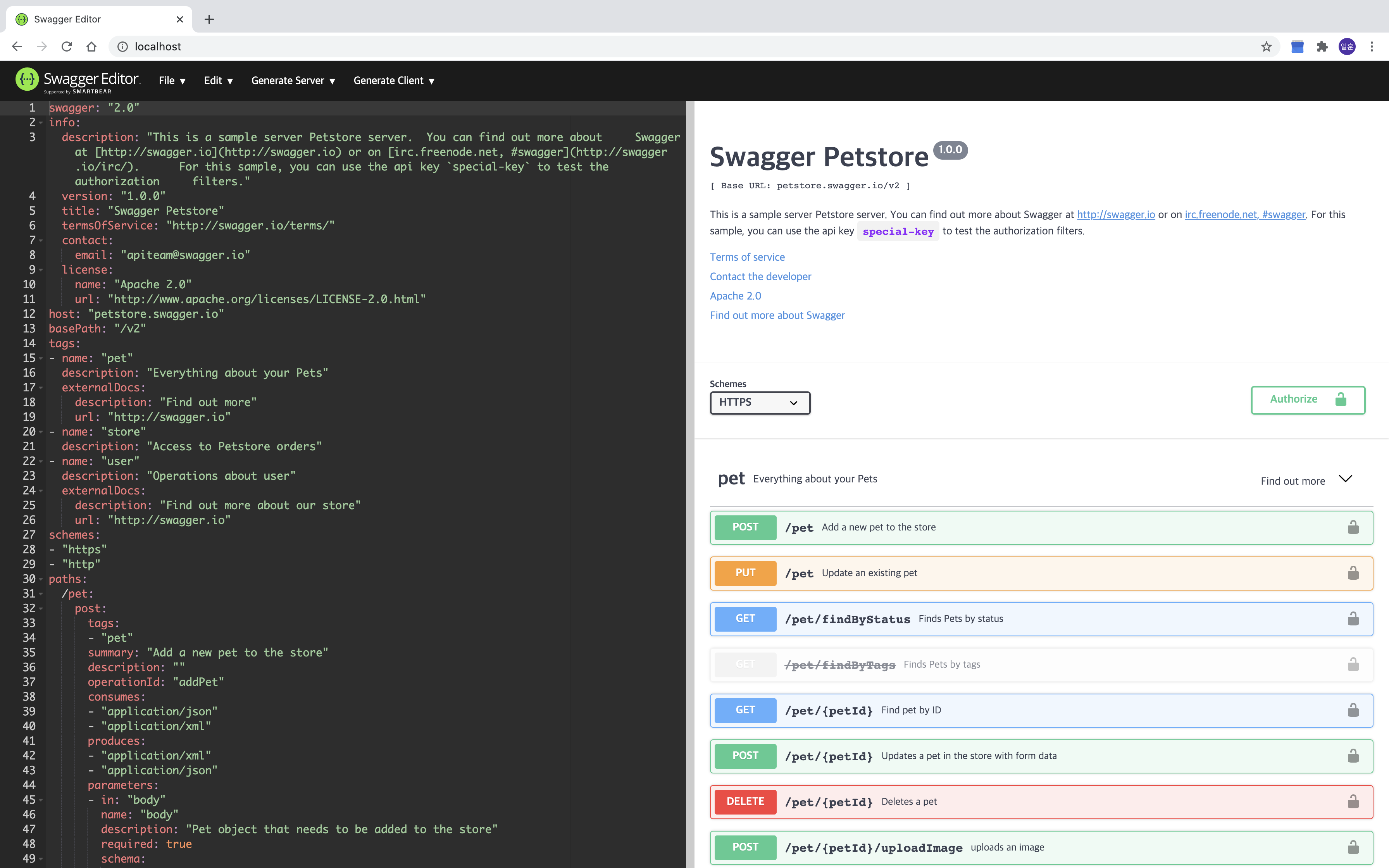 - 좌측 에디터에서 문법에 맞춰 API 내용을 작성하면 오른쪽 화면에 바로 반영이된다.