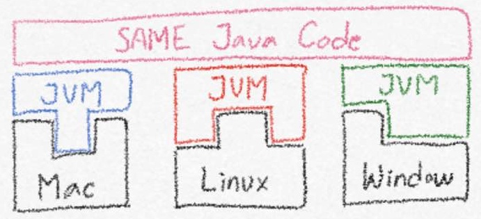 때문에 우리가 작성하는 자바 프로그램은 OS에 상관없이 JVM만 설치되있다면 동일한 코드로 동일한 동작을 할 수 있는 것입니다.