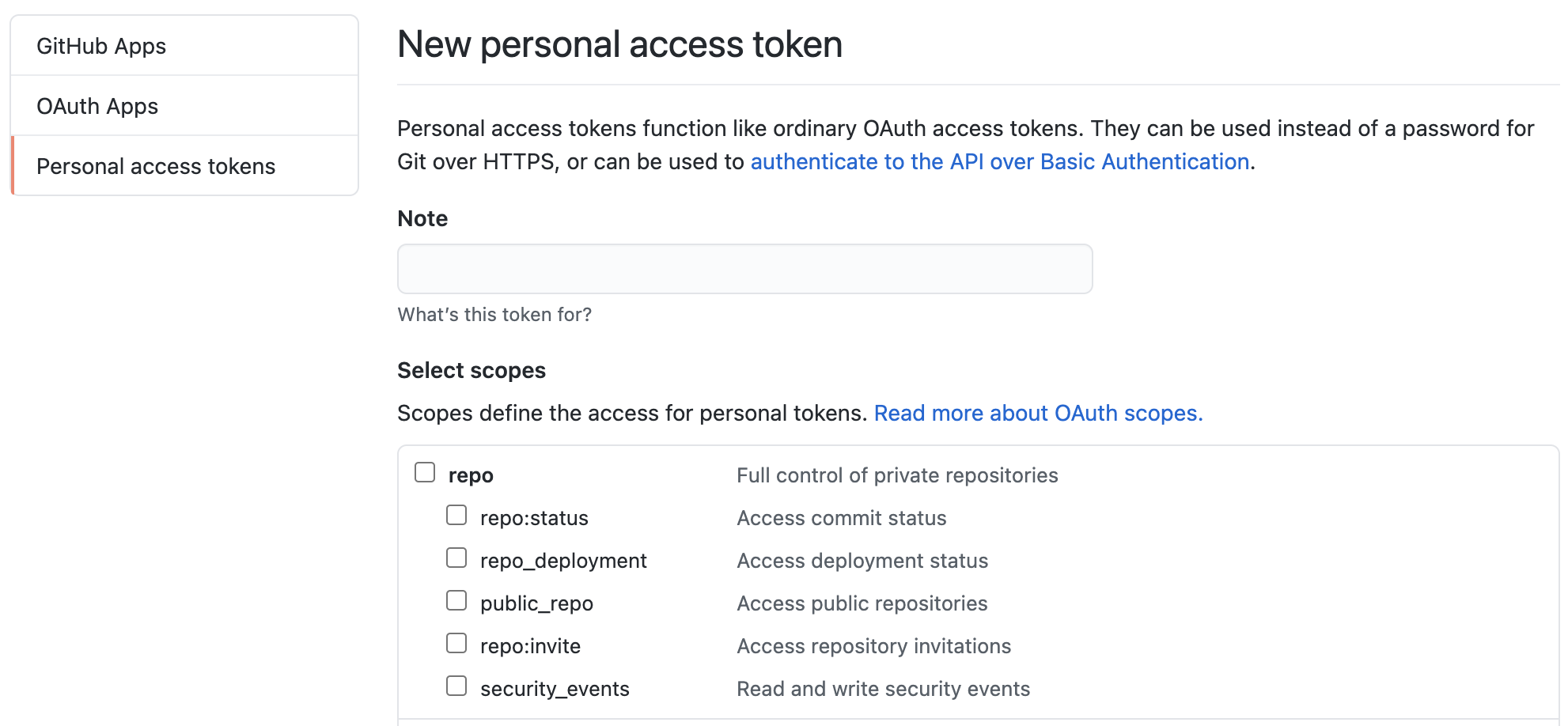 - Note 란에 원하는 이름을 작성하고, repo 체크박스를 체크한 뒤 Generate Token 버튼을 클릭한다.