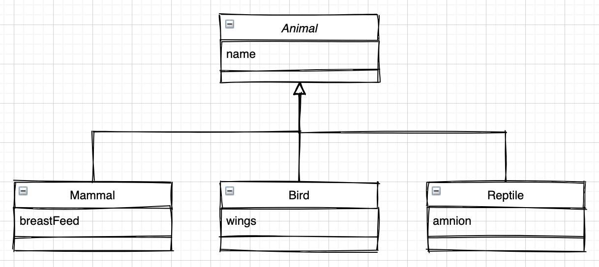 아래 다이어그램에서 Animal(동물)은 Mammal(포유류), Bird(조류), Reptile(파충류)의 상위 클래스이다.