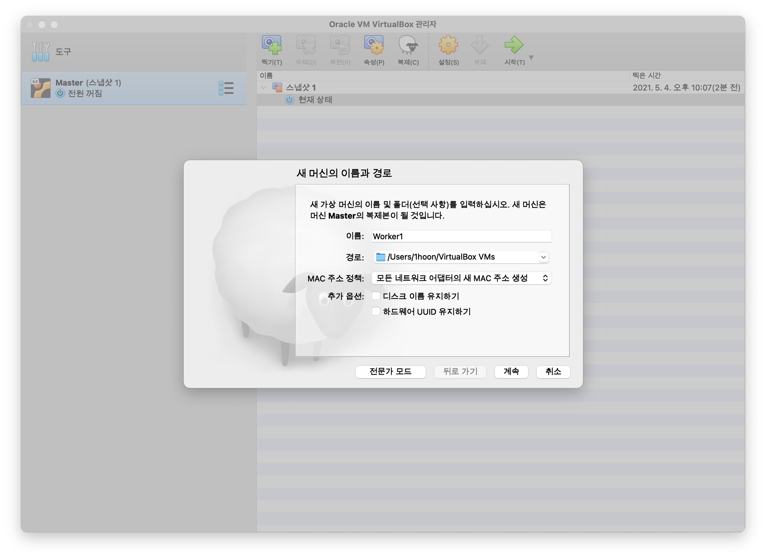 새 머신의 이름과 경로 창이 뜨면, 아래와 같이 입력 후 계속 버튼을 클릭합니다.