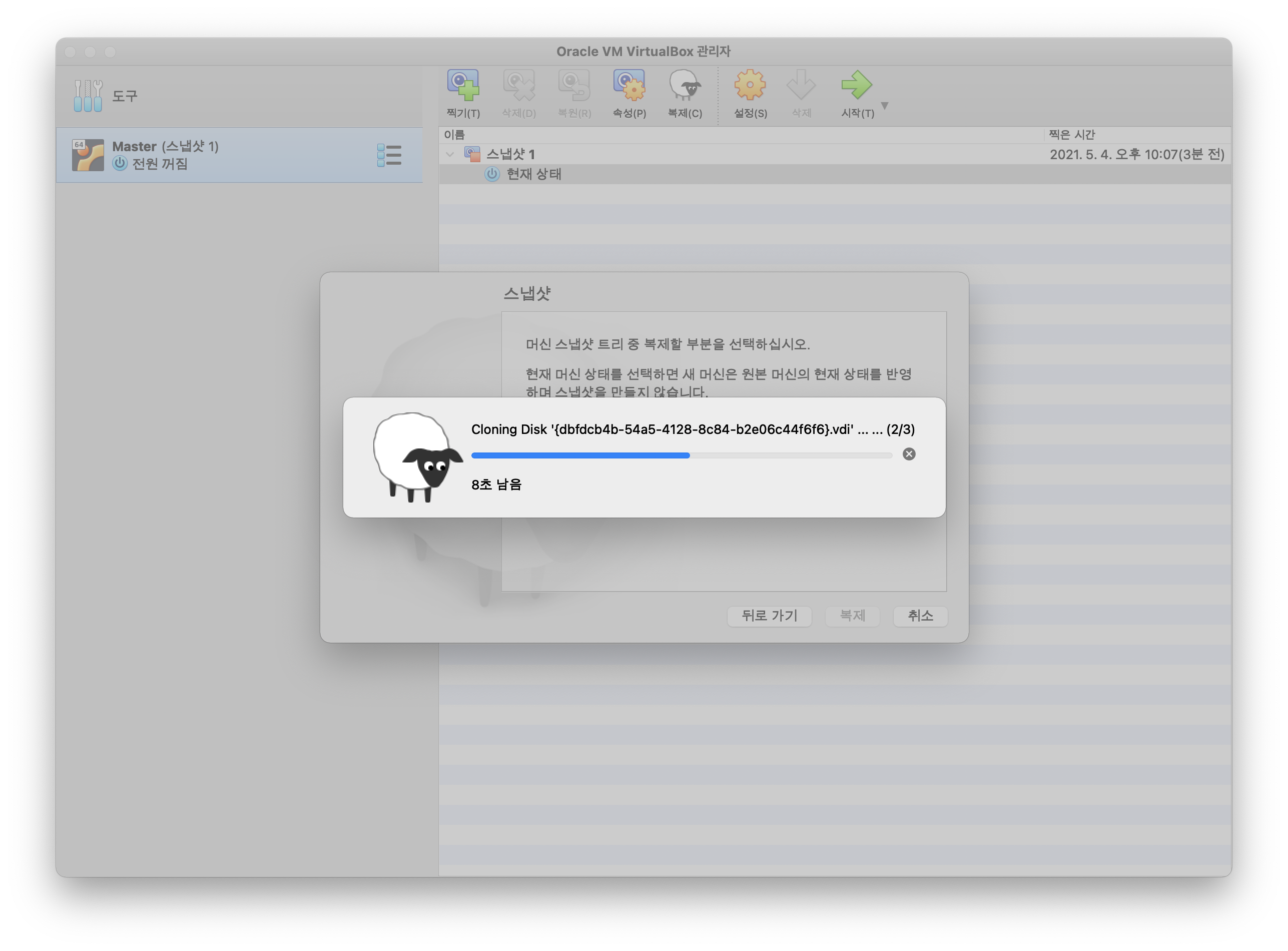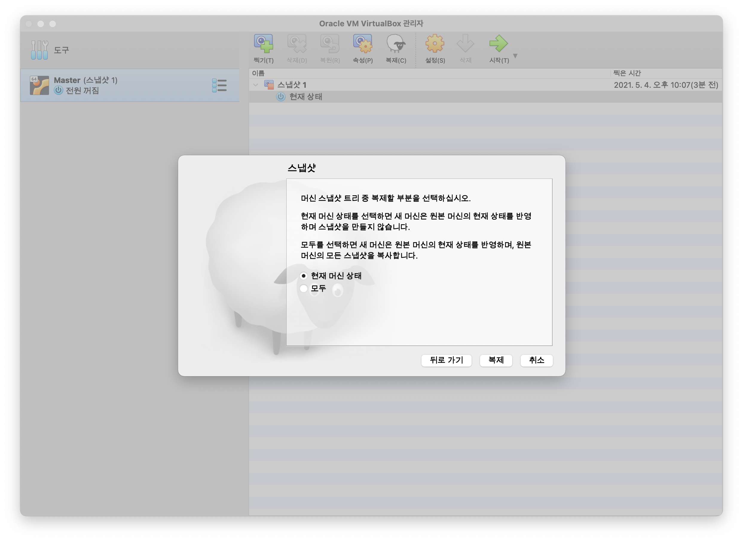 스냅샷 창이 뜨면 현재 머신 상태를 체크한 후 복제 버튼을 클릭합니다.