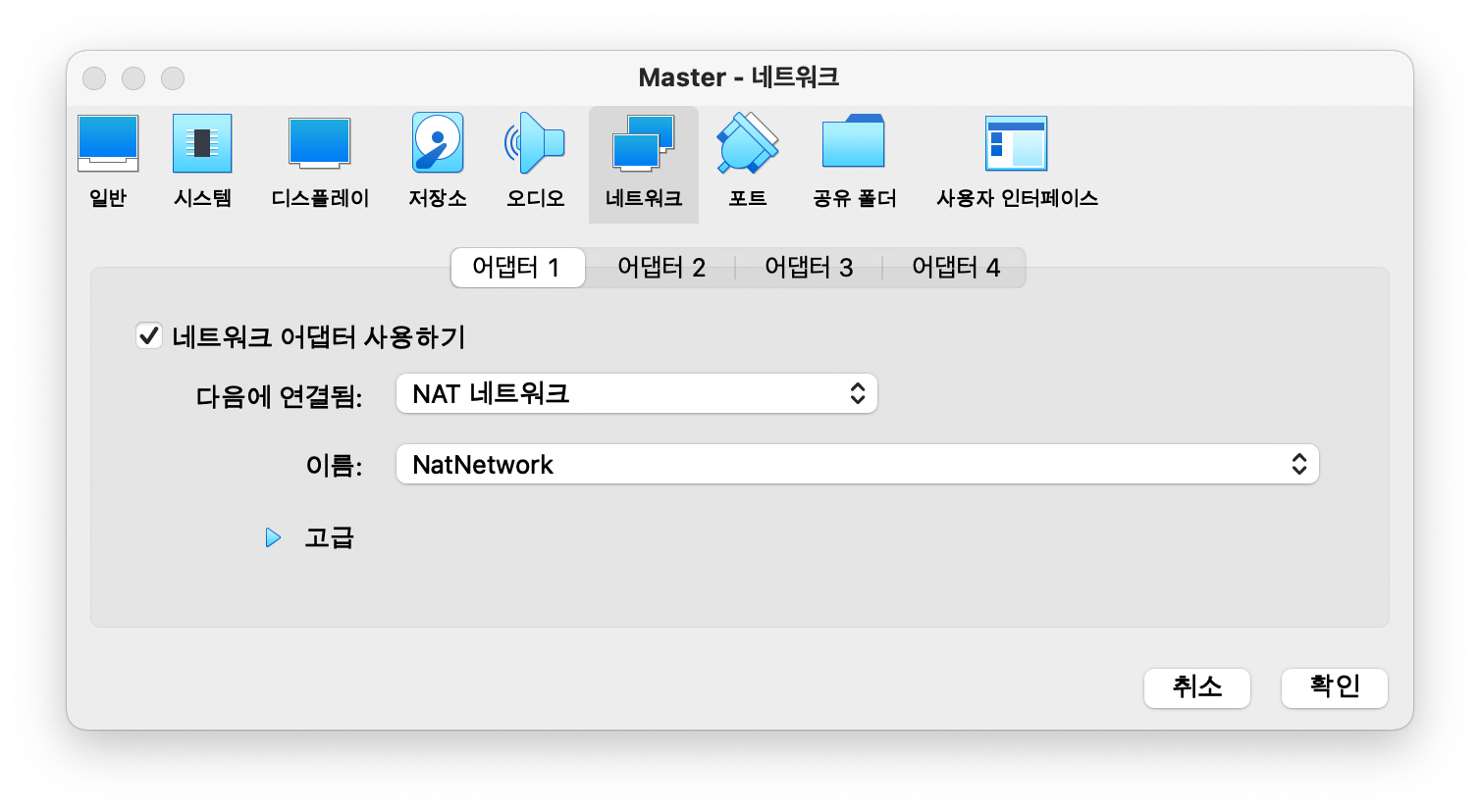각각의 VM 들(Master, Worker1, Worker2)의 설정을 열어 네트워크를 클릭하고 어댑터1의 속성을 아래와 같이 변경합니다.