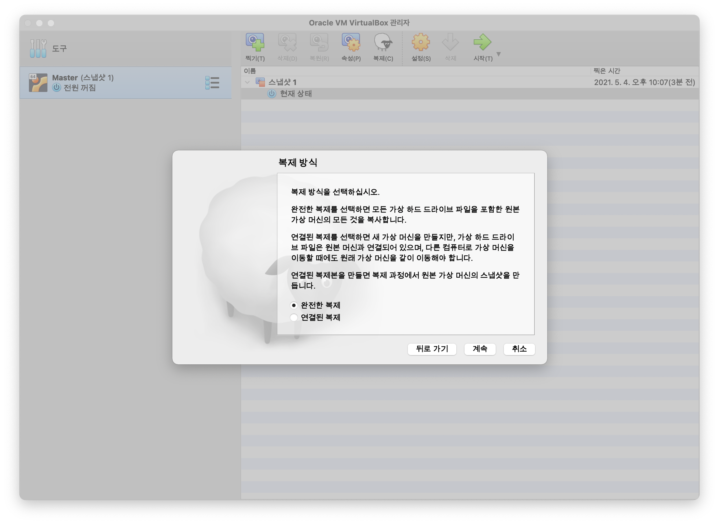 복제 방식은 완전한 복제를 선택한 후 계속 버튼을 클릭합니다.