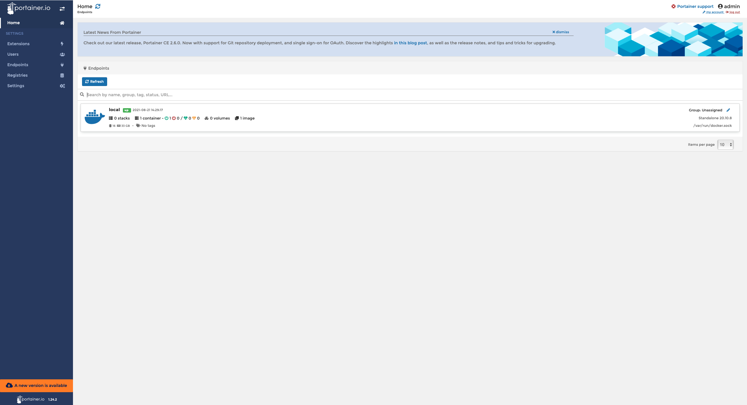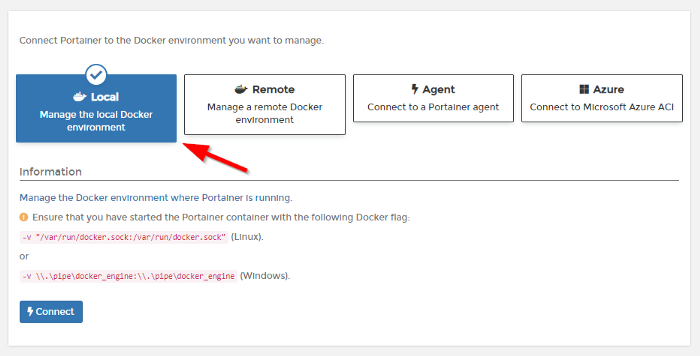 다음은 Portainer가 관리할 Docker 환경을 선택하는 화면입니다.