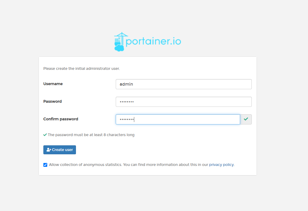 브라우저에서 위 URL로 접속시 아래와 같은 화면이 나오는데요, 관리자 계정을 생성하는 화면입니다.