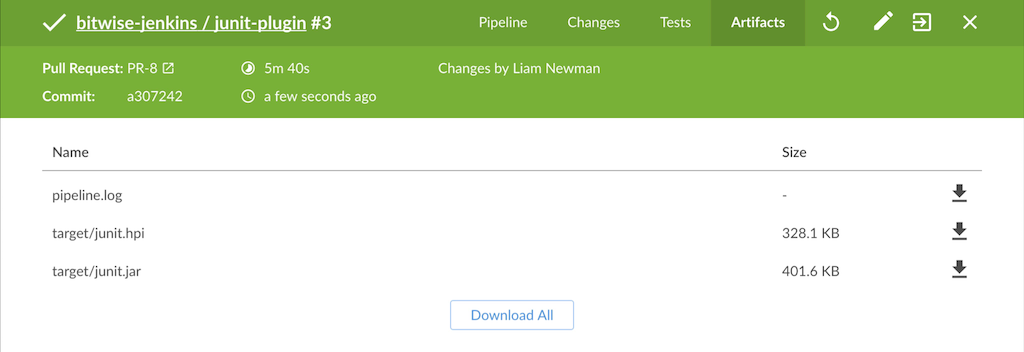 Aritifacts 탭에서는 업로드할 산출물과 파이프라인 전체 로그를 확인할 수 있는데요. 사실 빌드 산출물을 젠킨스 서버에 업로드하는 것은 좋은 선택은 아닙니다. 따라서, 도커를 사용하시는 경우에는 파이프라인 마지막 단계에 도커 이미지를 빌드하고 도커 레지스트리에 빌드된 이미지를 업로드하시는 것을 추천드립니다.
