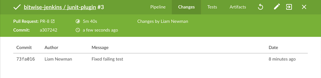 Changes 탭에서는 파이프라인을 실행한 커밋에 대한 내용을 확인할 수 있습니다.