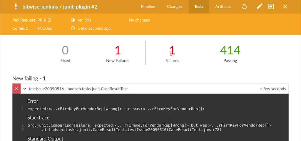 Tests 탭에서는 테스트 결과에 대한 정보를 확인할 수 있습니다. 이 탭은 JUnit 테스트 스텝이 존재할 경우에만 정보가 노출됩니다.