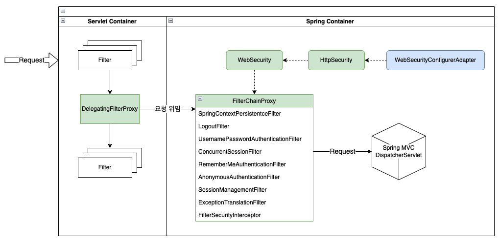 때문에 스프링 시큐리티는 DelegatingFilterProxy를 통해 서블릿 컨테이너에서 필터로서 요청을 취득하고, 스프링 컨테이너에 존재하는 특정 빈(name = springSecurityFilterChain)을 찾아 요청을 위임합니다.