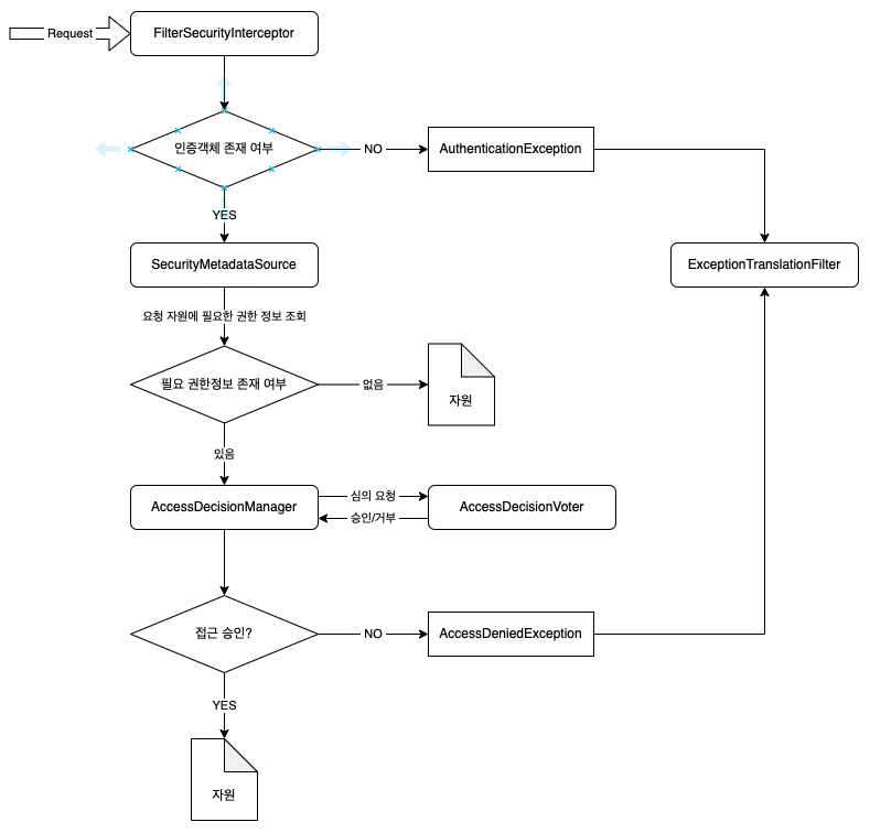 - 요청 시 앞선 FilterChainProxy 에서 인증 처리가 완료되고, FilterSecurityInterceptor 로 전달됩니다.