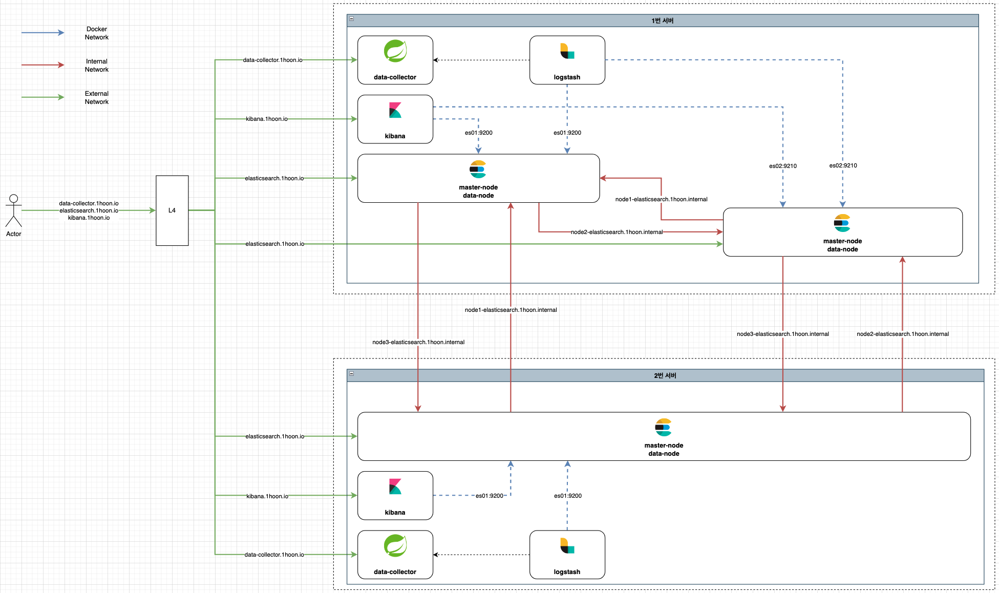 - 같은 서버 내부에서의 통신(Elasticsearch - Kibana / Elasticsearch - Logstash)은 docker network를 통하도록 했습니다.