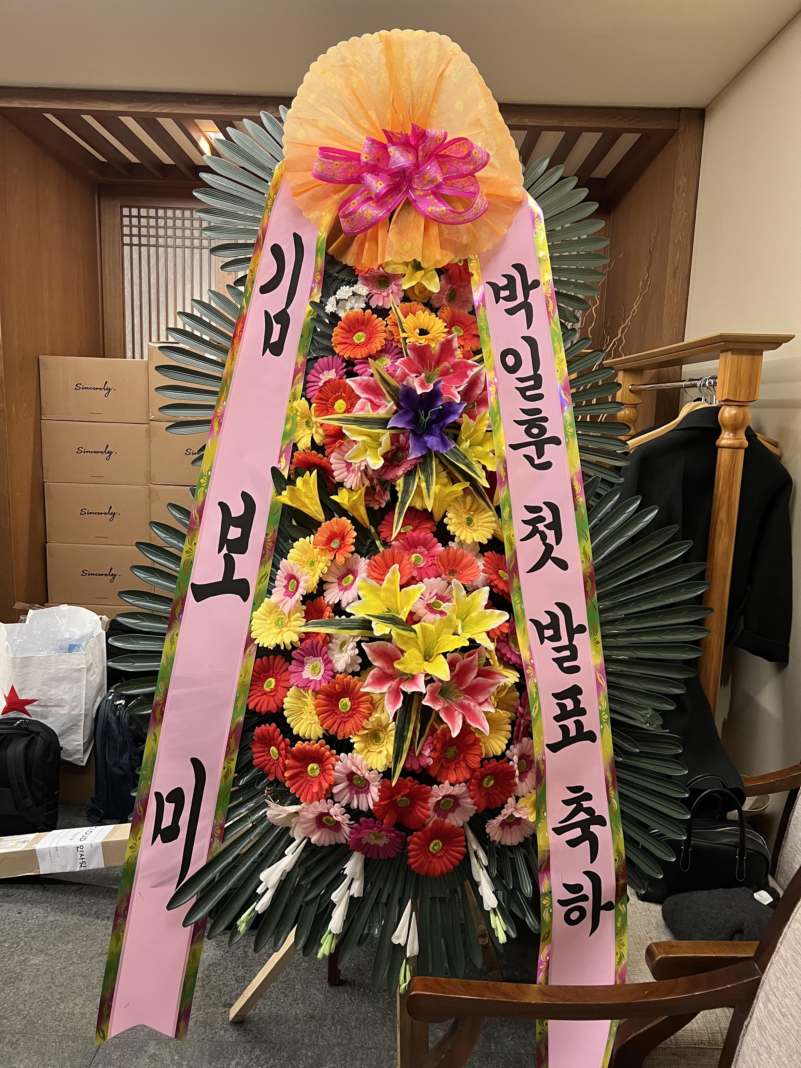 화환 띠를 보니 발표자 초대 티켓을 줬던 친구가 보내준 화환이었습니다. 거기서 아무도 화환을 받은 사람이 없는데 저 혼자 갑자기 받아서 리허설할 때보다 더 떨리더라구요. 굉장히 놀라고 수치스러운 상태에서 행사 진행을 담당하시는 수석님께서 공간이 지금 혼잡하니 폐백실로 일단 옮겨두자고 하셔서 옮겨두었습니다.
