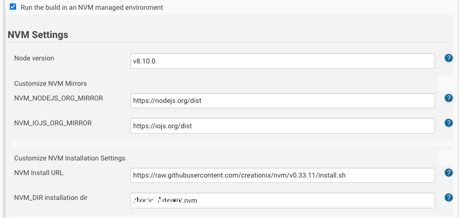 빌드 환경 탭에서 Run thie build in an NVM managed environment 옵션을 체크하면 아래와 같은 입력 폼이 노출됩니다.