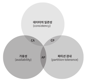 - CA : 일관성과 가용성을 지원하는 저장소. 통상 내트워크 장애는 피할 수 없는 일로 여겨지므로, 분산 시스템은 반드시 파티션 문제를 감내할 수 있도록 설계되어야 한다. 그러므로 실세계에 CA 시스템은 존재하지 않는다.