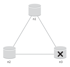 위 그림은 n3에 장애가 발생해 n1, n2와의 통신이 불가능한 상황이다. n1, n2에 기록한 데이터는 n3로 전달되지 않고, 반대의 경우도 동일하다.