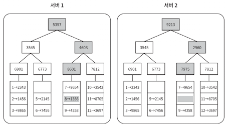 5. 루트 노드의 해시 값이 일치하면 두 서버는 같은 데이터를 갖는 것이다. 그 값이 다른 경우 왼쪽 자식 노드의 해시 값을 비교하교, 그 다음 오른쪽 자식 노드의 해시 값을 비교한다.